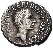 Marcus Aemilius Lepidus, Reitergeneral und Triumvir, * um -90, I E mit AL.2563003 R, II E mit Clodia, Tochter von Mark Antons 2.Frau Fulvia (AL.68/174337 H) und des Clodius Pulcher (AL.68/174336 H), + -12. Bruder des Lucius Aemilius Lepidus, AL.66/1065244 R. Er ist ein langjähriger Anhänger Caesars und beantragt 49 als Prätor dessen Ernennung zum Diktator. Er wird dann Statthalter der Hispania Citerior und 46 gemeinsam mit Caesar Consul. Nach Caesars Ermordung bildet er am 27.11.43 gemeinsam mit Octavian (AL.68/5125374 R) und Mark Anton (AL.69/8590499870 G) das 2.Triumvirat. Der Einfluss des Lepidus wird aber von seinen beiden Kollegen immer mehr eingeschränkt. Verwaltet er zunächst noch die ihm von Caesar anvertrauten Provinzen Gallia Narbonensis und Hispania citerior, wird er bald auf Afrika beschränkt und als er 36 für Pompeius (AL.65/786826 R) Partei ergreift, wird er von Octavian vollständig entmachtet. Es bleibt ihm nur die 43 erteilte Würde des Pontifex Maximus, der er es wohl zu verdanken hat, dass er die Machtkämpfe überlebt und 12 in Ruhe sterben kann.